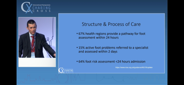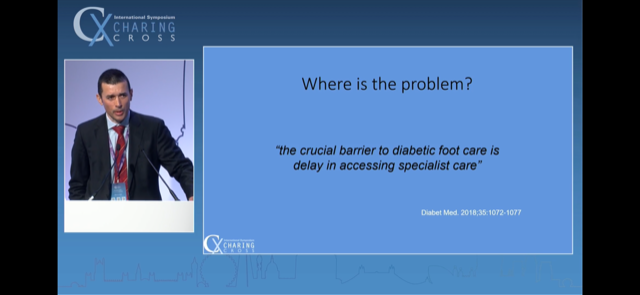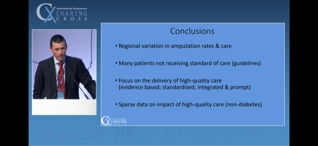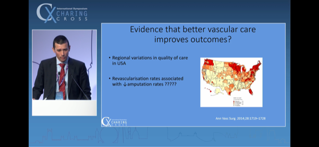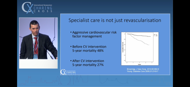 Very slick. Highlighted that time-to-specialist-intervention is variable and is the main bottleneck. Detailed a number of important lower limb revasc. papers clearly along his slides - which exam going trainees in particular will find particularly valuable.
